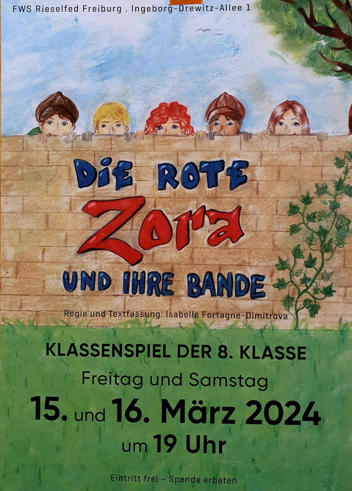 Die achte Klasse der Freien Waldorfschule Freiburg-Rieselfeld spielt am 15. und 16. März jeweils um 19 Uhr ihr Klassenspiel "Die rote Zora" im Festsaal der Schule. Der Eintritt ist frei, Spenden sind erbeten.