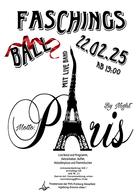 Die Freie Waldorfschule Freiburg-Rieselfeld lädt ein zum Faschingsball mit Live-Musik! Unter dem Motto "Paris by night" wird es am Samstag, den 22.02.25 ab 19 Uhr Musik und Tanz geben, eine Getränkebar, Buffet, Holzofenpizza u.v.m. Der Unkostenbeitrag liegt bei 14€, ermäßigt 6€. Wir freuen uns auf Ihr Kommen!