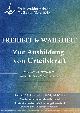 Die Frage nach der Ausbildung von Urteilskraft ist eine Frage, die uns in der heutigen Zeit stark herausfordert - auf persönlicher Ebene und im pädagogischen Wirken. Philosoph und Theologe Prof. Dr. Harald Schwaetzer entfaltet in einem Vortrag diese Frage vor dem Hintergrund von dem Verhältnis von Wahrheit und Freiheit. Der Vortrag findet am Freitag, den 26. September um 19:30 Uhr im Musikraum neben dem Festsaal in der Freien Waldorfschule im Rieselfeld statt. Der Eintritt ist frei, Spenden sind erbeten. Herzliche Einladung!