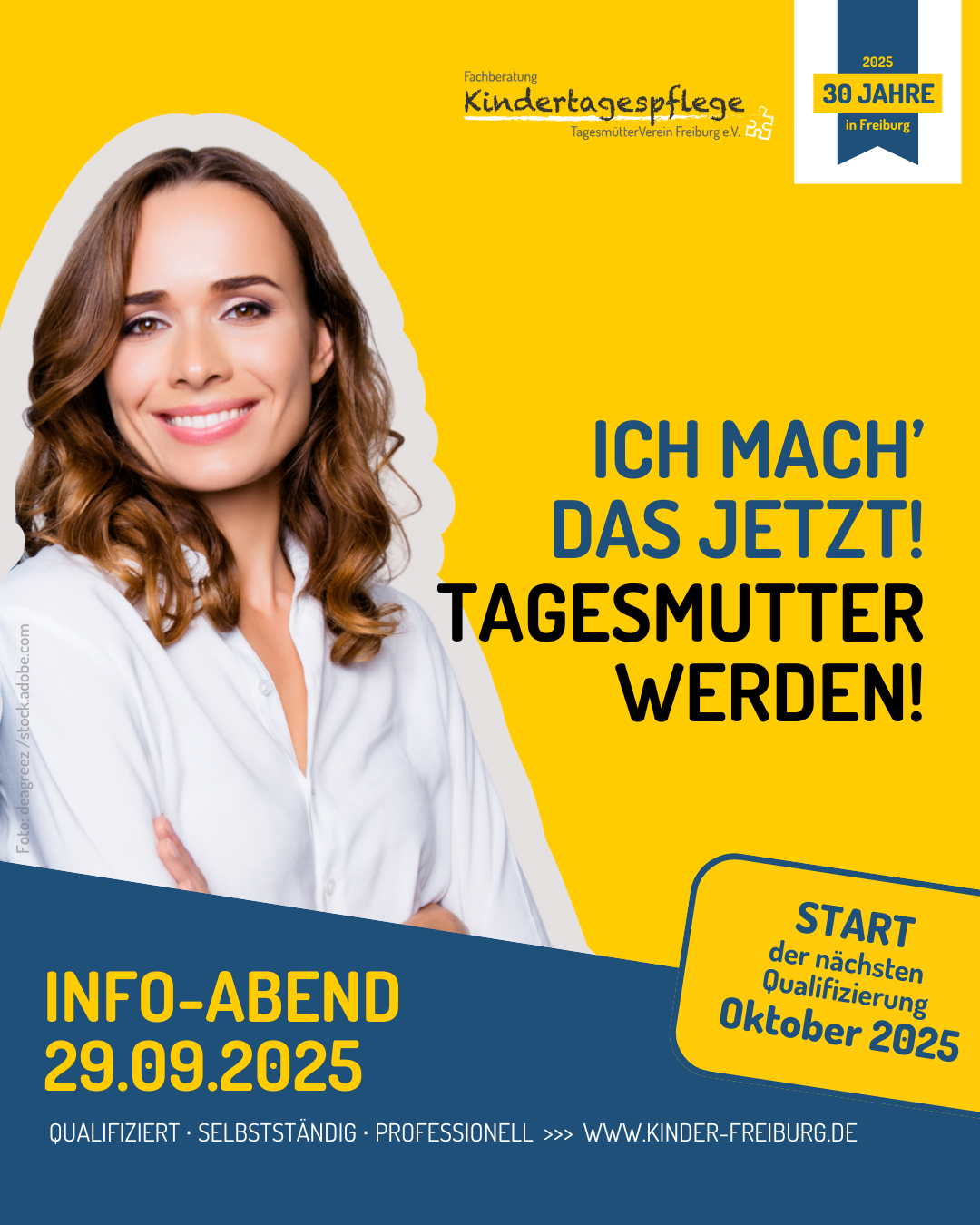 Am 29. September 2025 lädt die Fachberatung Kindertagespflege ∙ TagesmütterVerein Freiburg e. V. zum nächsten Info-Abend über das Berufsbild der Tagesmutter bzw. des Tagesvaters ein. Die Veranstaltung beginnt um 19:00 Uhr in der Geschäftsstelle in der Jakob-Burckhardt-Straße 1. Unter dem Motto „Ich mach’ das jetzt! Tagesmutter oder Tagesvater werden!“ gibt die Veranstaltung Einblicke in das vielseitige Tätigkeitsfeld der Kindertagespflegeperson – und zeigt auf, wie der Einstieg gelingt.