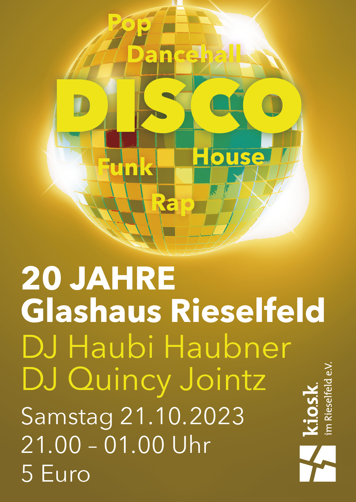 Das Glashaus tanzt auf zwei Dance Floors; im Saal legen DJ Haubi Haubner und DJ Quincy Jointz auf, im Partyraum mixt DJ Chris bunt die Musik ab den 70igern; die Ehrenamtlichen des AK Disco und von Rieselrock shaken Cocktails und schenken Getränke aus.