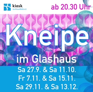 Ein Feierabendgetränk außer Haus?! Kommt am Samstag ab 20:30 ins Café ins Glashaus. Bei gemütlicher Stimmung gibt es Drinks (Limos, Cocktails, Weine, Bier...) und Musik. Wir freuen uns auf Euch. Ehrenamtlich aus dem Rieselfeld fürs Rieselfeld - sas Kneipen Team von K.I.O.S.K.